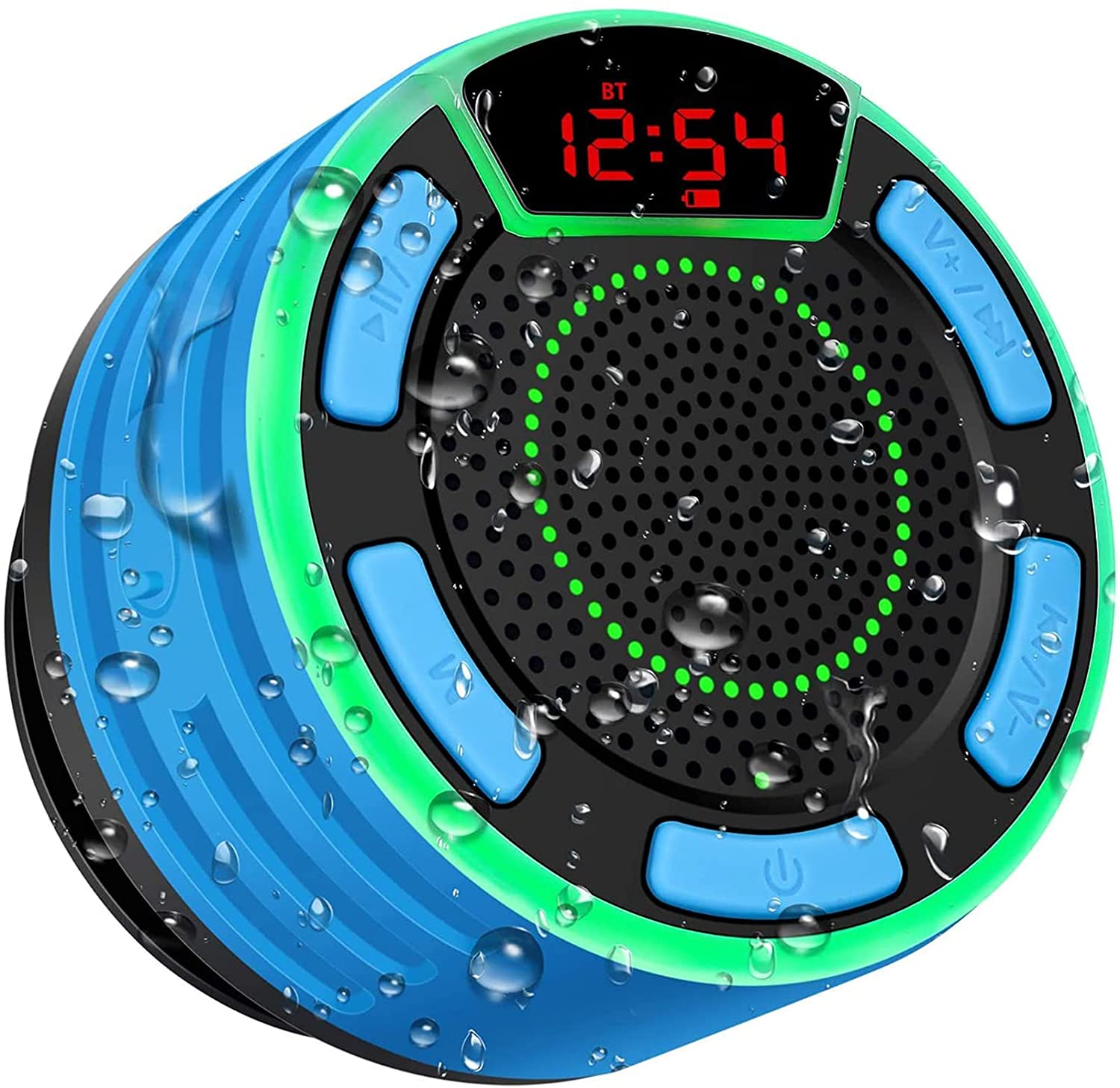 Bluetooth Shower Speaker, IPX7 Waterproof Portable Speaker with LED Light, Suction Cup, Hook, Stereo Sound, True Wireless Stereo Mini Speaker with Built-in Mic, FM Radio, for Bathroom, Pool, Outdoors