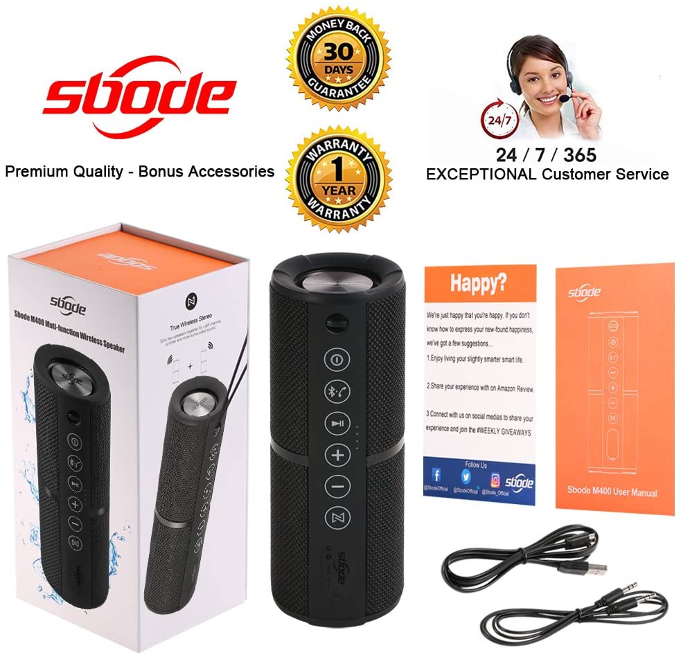 Sbode M400 Speakers providing 8 hours playing time and only takes 3 hours to be fully recharged. Its rubberized housing and IPX6 rating make it a great option for trips to the beach, singing in the shower, or basically